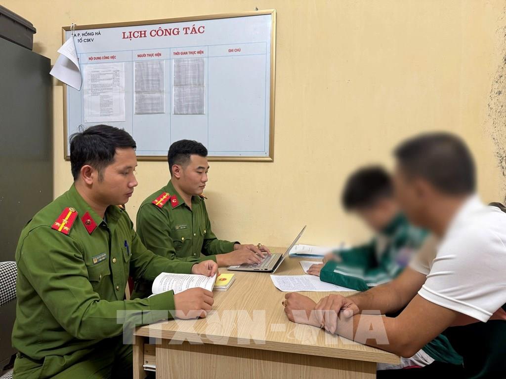 Em V.T.Đ được bố đưa đến Cơ quan Công an trình báo nguyên nhân vụ việc. Ảnh: TTXVN phát