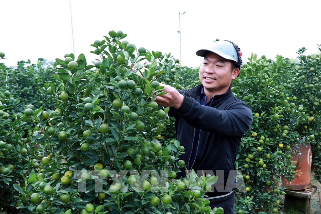Người dân tích cực chỉnh dáng, chăm sóc để quất chín đúng độ Tết. Ảnh: Nguyễn Lành - TTXVN