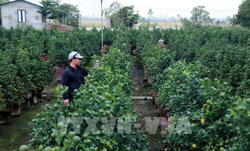 Người dân đến các nhà vườn ở phường Vị Khê (Ninh Bình) để lựa chọn quất. Ảnh: Nguyễn Lành - TTXVN