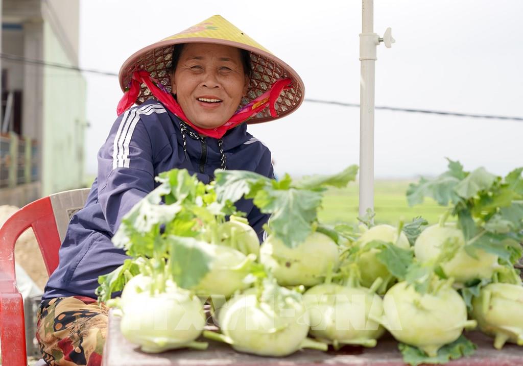 Gia đình ông Lê Văn Tuế, thôn An Định, có 4 sào đất (khoảng 2.000m²) trồng rau màu các loại, sản lượng năm nay tăng cao so với năm trước như giá bán chỉ đạt khoảng 50% so với các năm. Ảnh: Thanh Thuỷ-TTXVN