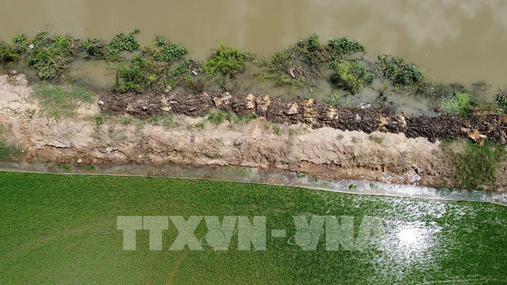 Theo người dân địa phương, khoảng 20 giờ cùng ngày, do ảnh hưởng của triều cường lên cao, một đoạn đê bao dài khoảng 20m bị sạt lở.