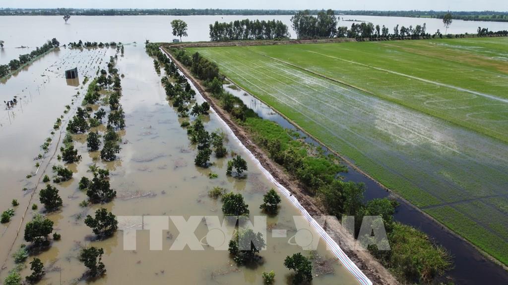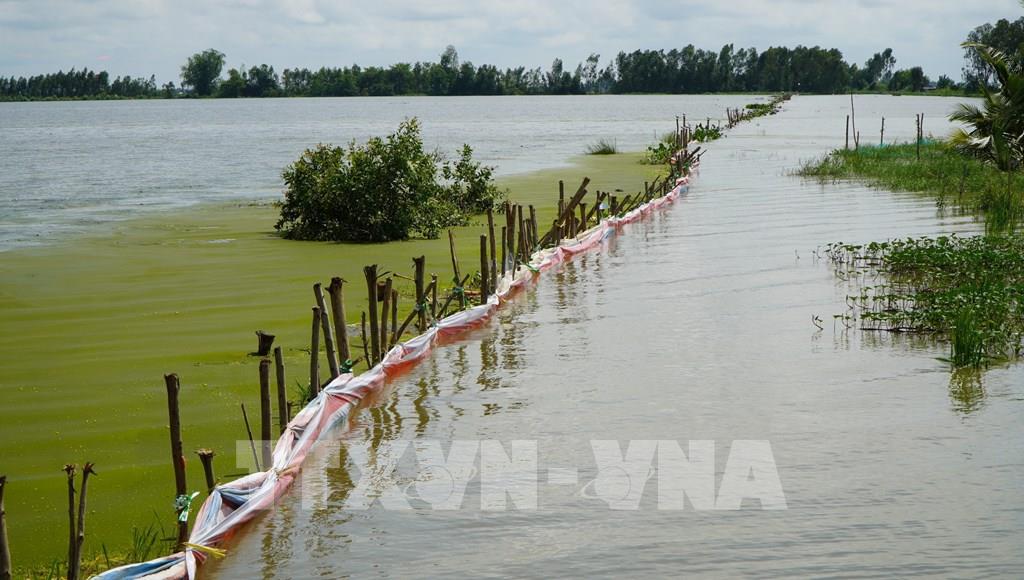 Nước lũ dâng cao, làm vỡ đê bao, nước tràn vào cánh đồng lúa rộng khoảng 133ha tại ấp 2, xã Trường Xuân (Đồng Tháp). Ảnh: Nhựt An - TTXVN