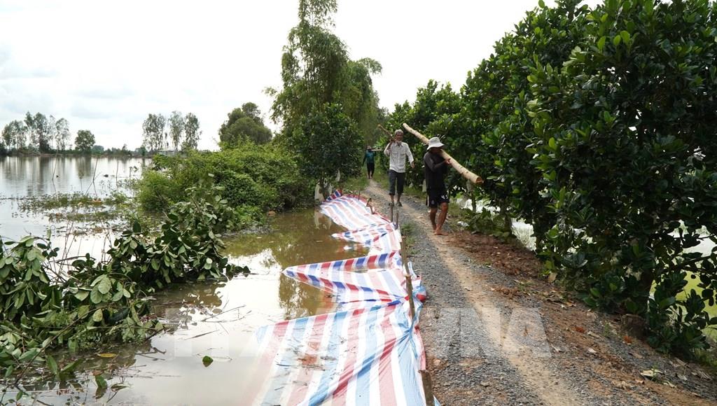 Nông dân ở xã Phương Thịnh (tỉnh Đồng Tháp) chuẩn bị cây gỗ để gia cố những đoạn đê bao yếu, bảo vệ lúa. Ảnh: Nhựt An - TTXVN