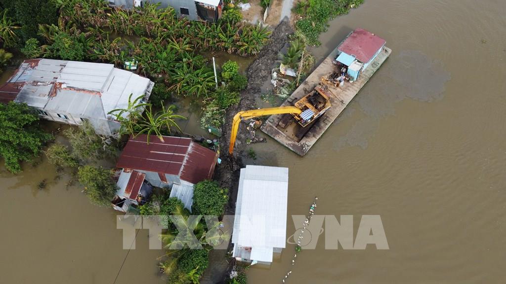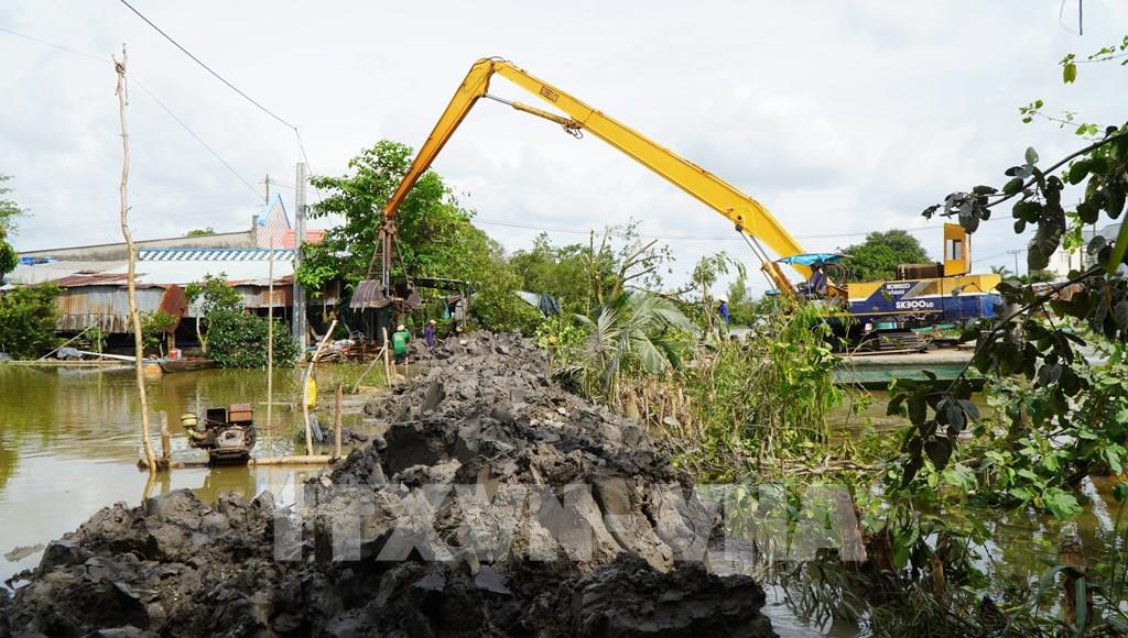 Người dân ấp 2A, xã Phương Thịnh thuê kobe (máy xúc) gia cố thêm đất ở những đoạn đê thấp để cứu lúa, cây ăn quả. Ảnh: Nhựt An - TTXVN
