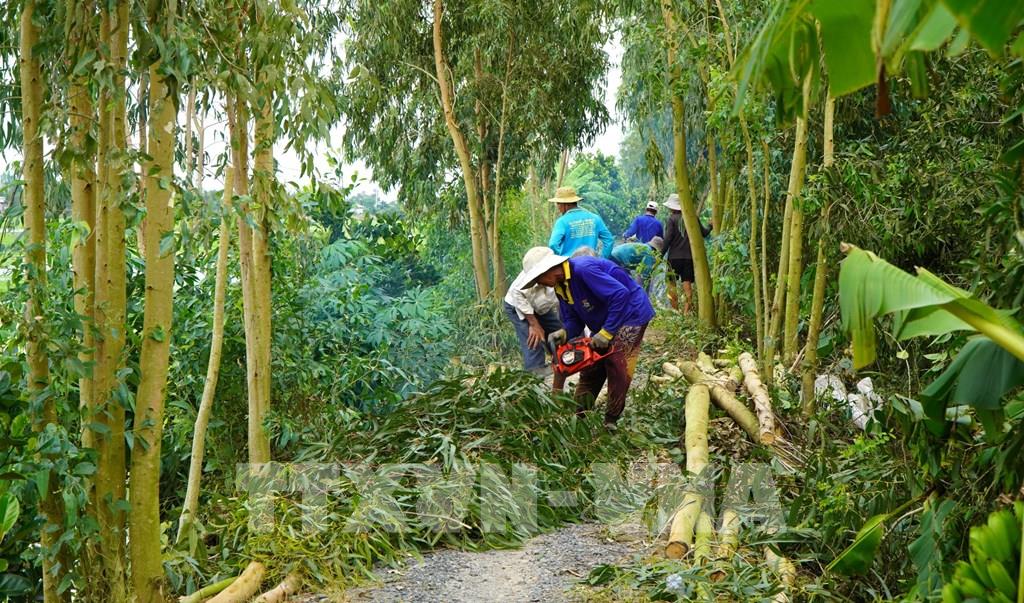 Nông dân ở xã Phương Thịnh cưa cây để gia cố những đoạn đê bao yếu, bảo vệ lúa. Ảnh: Nhựt An - TTXVN