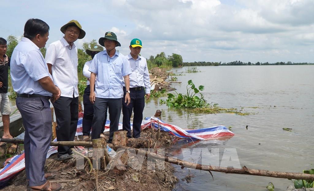 Lãnh đạo Sở Nông nghiệp và Môi trường tỉnh Đồng Tháp cùng lãnh đạo xã Phương Thịnh đến kiểm tra, nắm tình hình tại khu vực bị vỡ đê bao. Ảnh: Nhựt An - TTXVN
