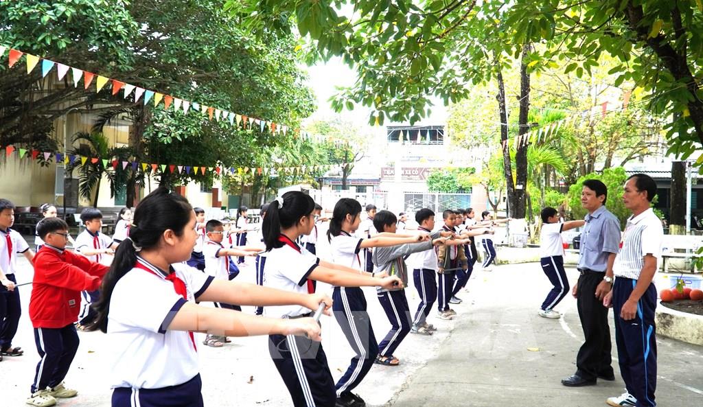 Thầy Phùng Nhật Dũng (thứ 2, phải sang), Hiệu trưởng Trường Tiểu học Dương Đông 4, đặc khu Phú Quốc trong giờ dạy thể dục. Ảnh: Văn Sĩ - TTXVN