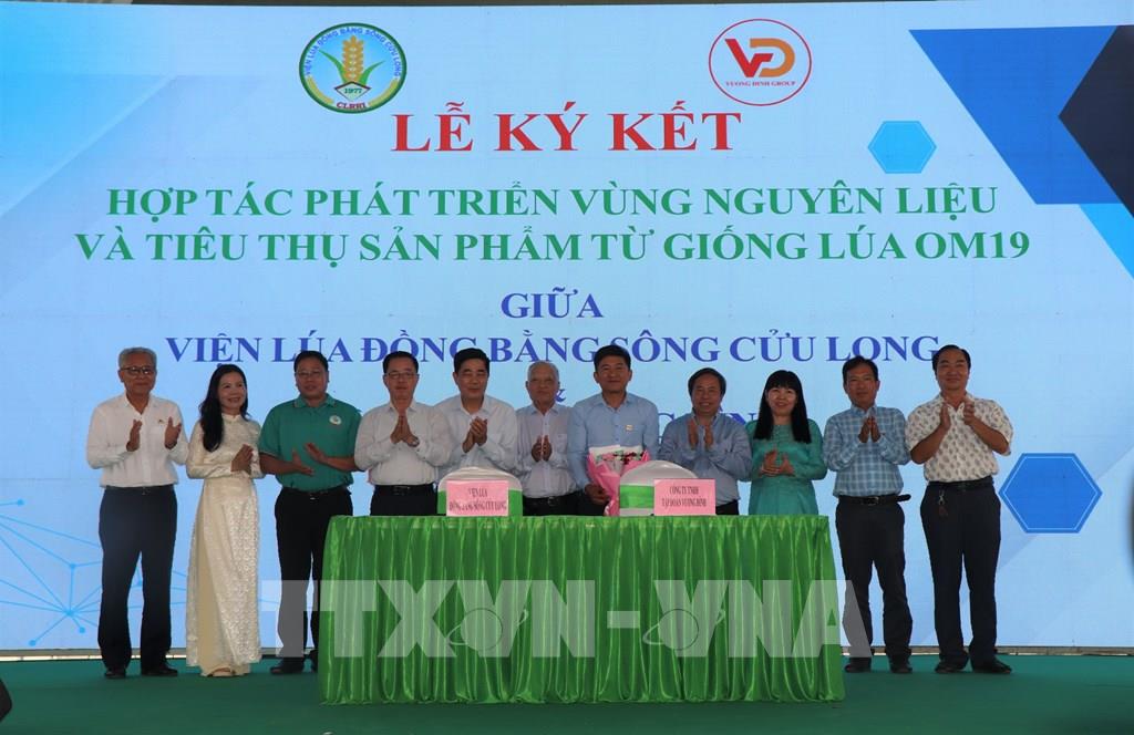Viện Lúa Đồng bằng sông Cửu Long và Công ty TNHH Tập đoàn Vương Đình ký kết hợp tác cùng phát triển sản xuất khoảng 200.000 ha lúa OM19 tại Đồng bằng sông Cửu Long nhằm xây dựng thương hiệu “Gạo Cần Thơ”. Ảnh: Thu Hiền - TTXVN