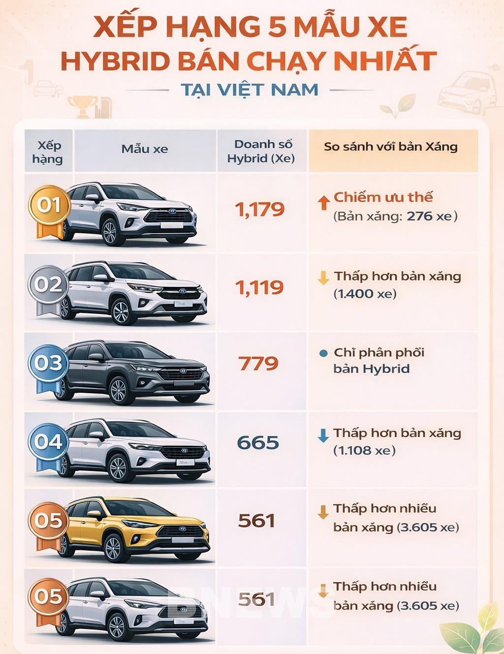 Đáng chú ý nhất là Toyota Yaris Cross khi phiên bản hybrid đạt doanh số 561 xe, thấp hơn nhiều so với bản xăng lên tới 3.605 xe. Điều này cho thấy dù xu hướng hybrid đang tăng trưởng, nhưng tại một số dòng xe mới, người tiêu dùng vẫn ưu tiên lựa chọn phiên bản truyền thống do yếu tố giá bán và thói quen sử dụng.