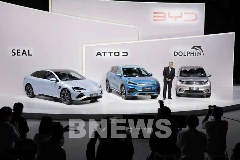 Ông lớn ô tô Trung Quốc BYD giới thiệu các sản phẩm xe điện chủ lực. Ảnh: Văn Xuyên/BNEWS/TTXVN