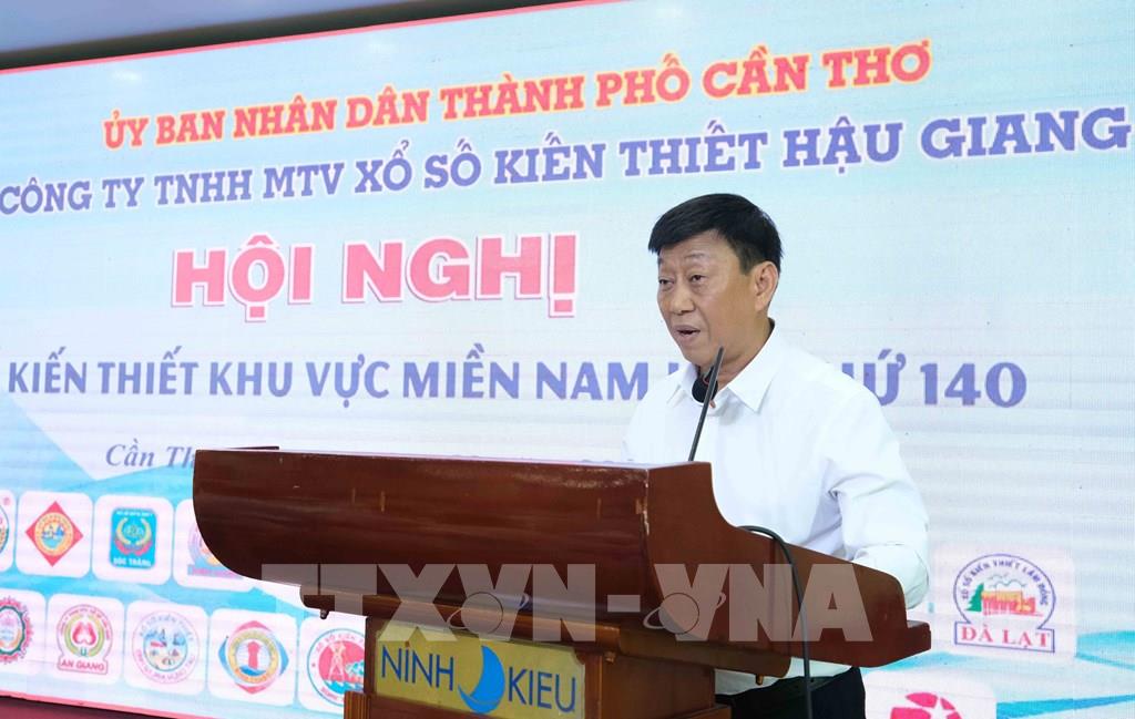 Ông Nguyễn Quốc Chiến, Chủ tịch Hội đồng Xổ số kiến thiết khu vực miền Nam, phát biểu tại Hội nghị. Ảnh: Thanh Liêm - TTXVN