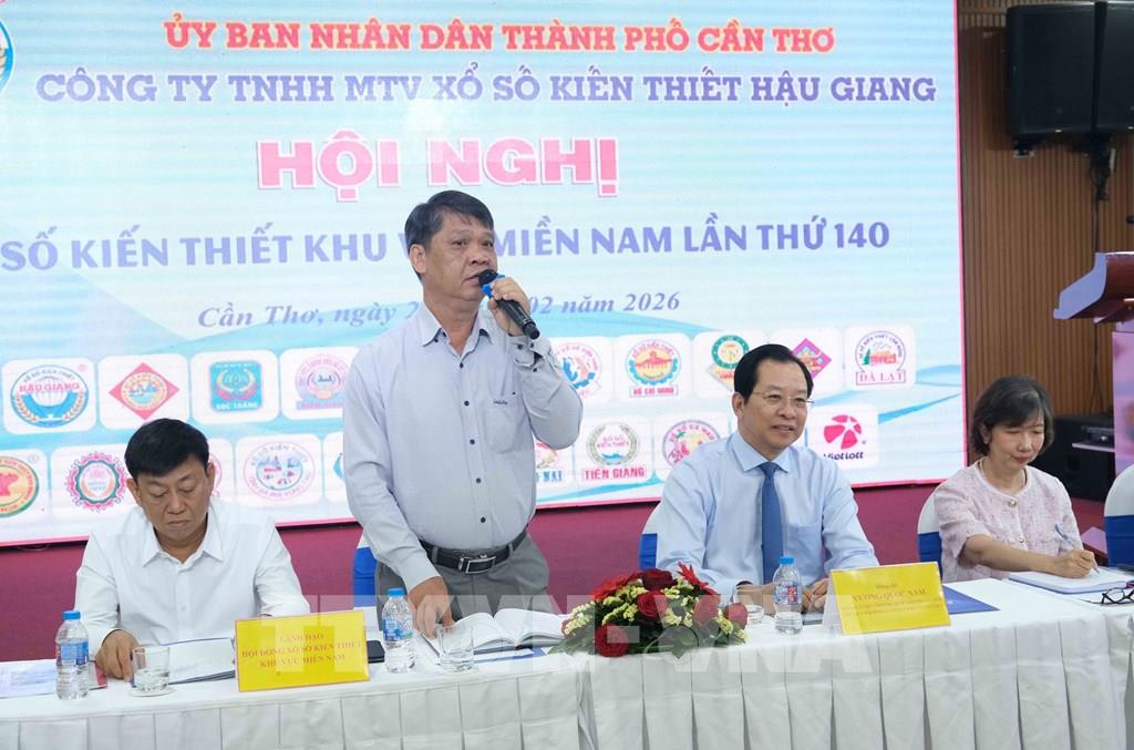 Ông Dương Minh Tú, Phó Chủ tịch Hội đồng Xổ số kiến thiết khu vực miền Nam, báo cáo kết quả kinh doanh năm 2025 các công ty xổ số khu vực miền Nam tại Hội nghị. Ảnh: Thanh Liêm - TTXVN