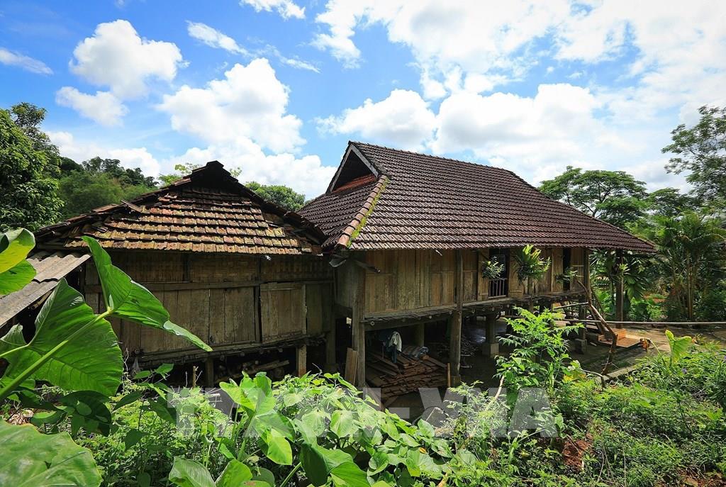 Những ngôi nhà sàn trầm mặc bên lối đi quanh co, nối tiếp nhau, không cổng vào, không ngăn cách. Ảnh: Trọng Đạt-TTXVN