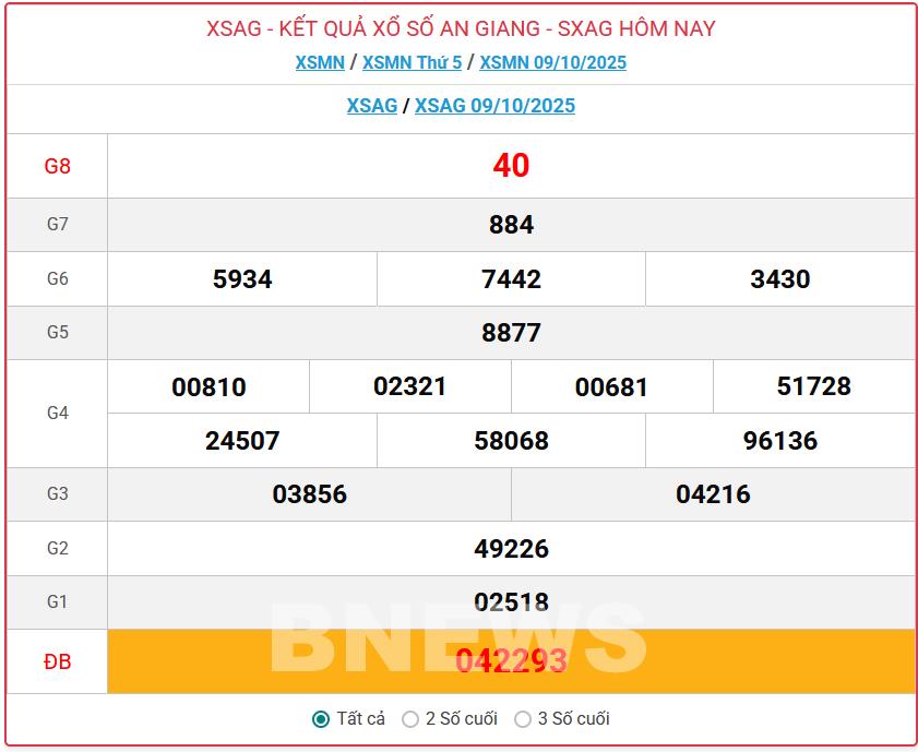 Bnews. XSAG 9/10. Kết quả xổ số hôm nay ngày 9/10. XSAG Thứ Năm. Trực tiếp KQXSAG ngày 9/10. Kết quả xổ số An Giang hôm nay ngày 9/10/2025. Kết quả xổ số An Giang Thứ Năm ngày 9/10/2025.