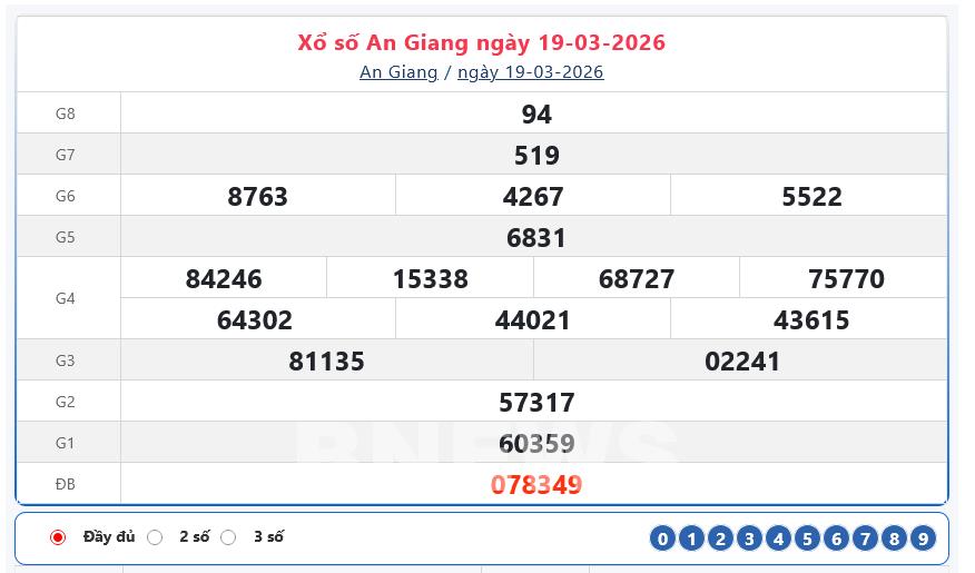 Kết quả xổ số An Giang Thứ Năm ngày 19/3/2026