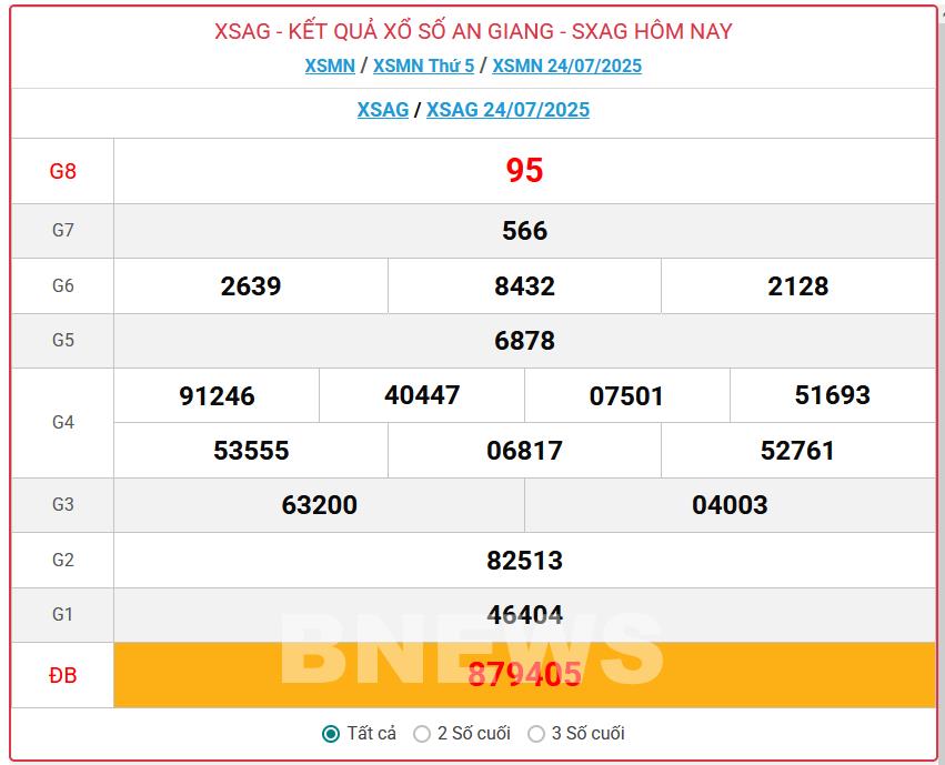 Bnews. XSAG 24/7. Kết quả xổ số hôm nay ngày 24/7. XSAG Thứ Năm. Trực tiếp KQXSAG ngày 24/7. Kết quả xổ số An Giang hôm nay ngày 24/7/2025. Kết quả xổ số An Giang Thứ Năm ngày 24/7/2025.