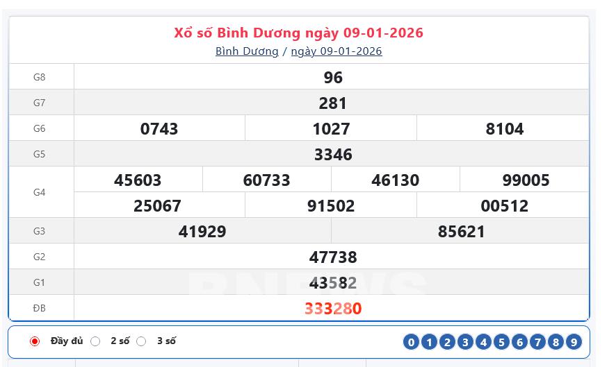 Kết quả xổ số Bình Dương ngày 9/1/2026