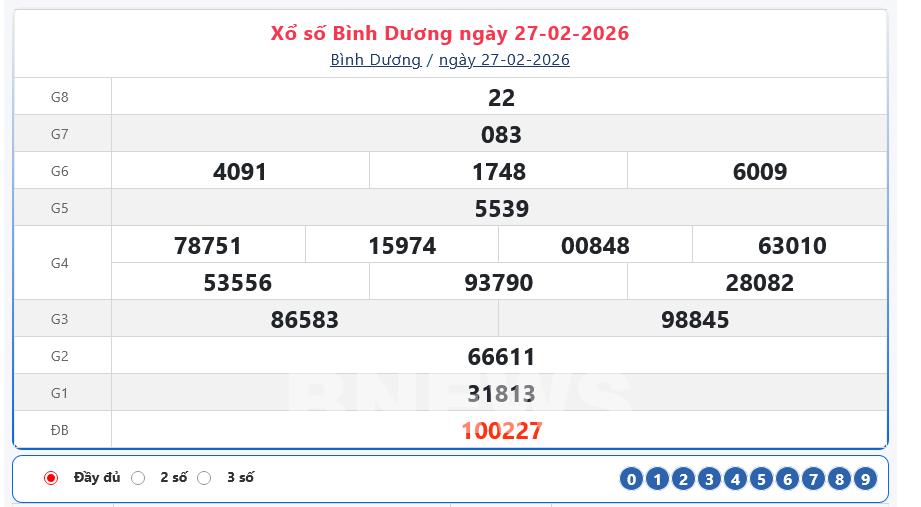 Kết quả xổ số Bình Dương ngày 27/2/2026