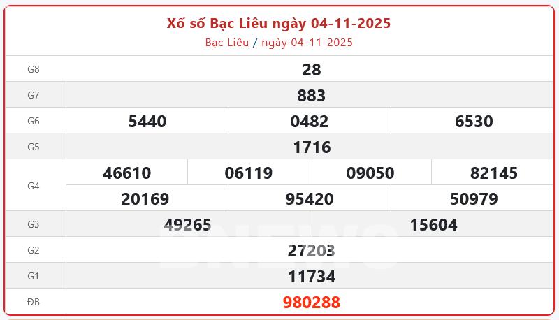 Bnews. XSBL 4/11. Kết quả xổ số hôm nay ngày 4/11. XSBL Thứ Ba. Trực tiếp KQXSBL ngày 4/11. Kết quả xổ số Bạc Liêu hôm nay ngày 4/11/2025. Kết quả xổ số Bạc Liêu Thứ Ba ngày 4/11/2025.
