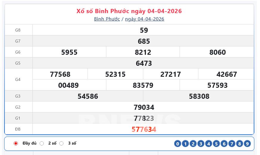 Kết quả xổ số Bình Phước ngày 4/4/2026