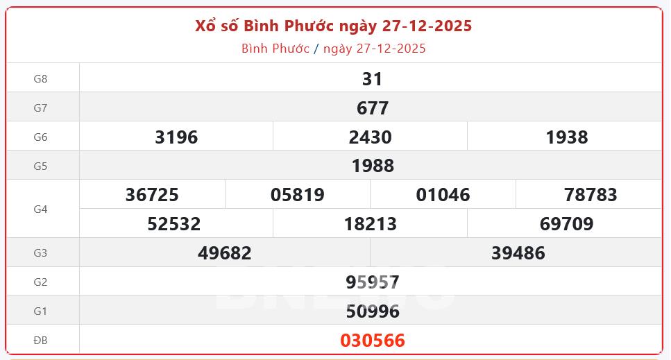 Bnews. XSBP 27/12. Kết quả xổ số hôm nay ngày 27/12. XSBP Thứ Bảy. Trực tiếp KQXSBP ngày 27/12. Kết quả xổ số Bình Phước hôm nay ngày 27/12/2025.