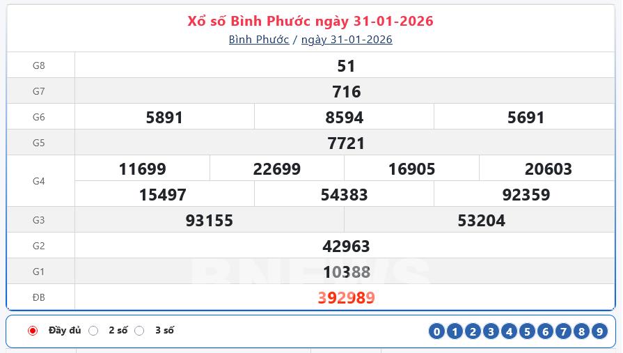 Bnews. XSBP 31/1. Kết quả xổ số hôm nay ngày 31/1. XSBP Thứ Bảy. Trực tiếp KQXSBP ngày 31/1. Kết quả xổ số Bình Phước hôm nay ngày 31/1/2026.
