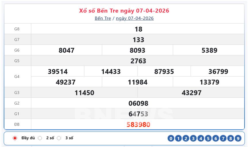 Kết quả xổ số Bến Tre Thứ Ba ngày 7/4/2026