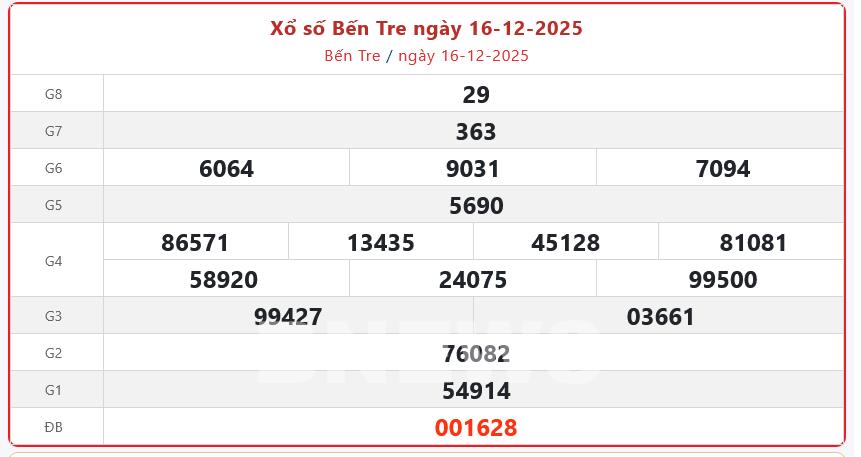 Kết quả xổ số Bến Tre Thứ Ba ngày 16/12/2025