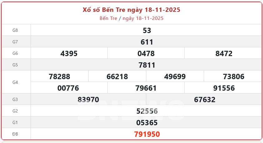 Kết quả xổ số Bến Tre Thứ Ba ngày 18/11/2025