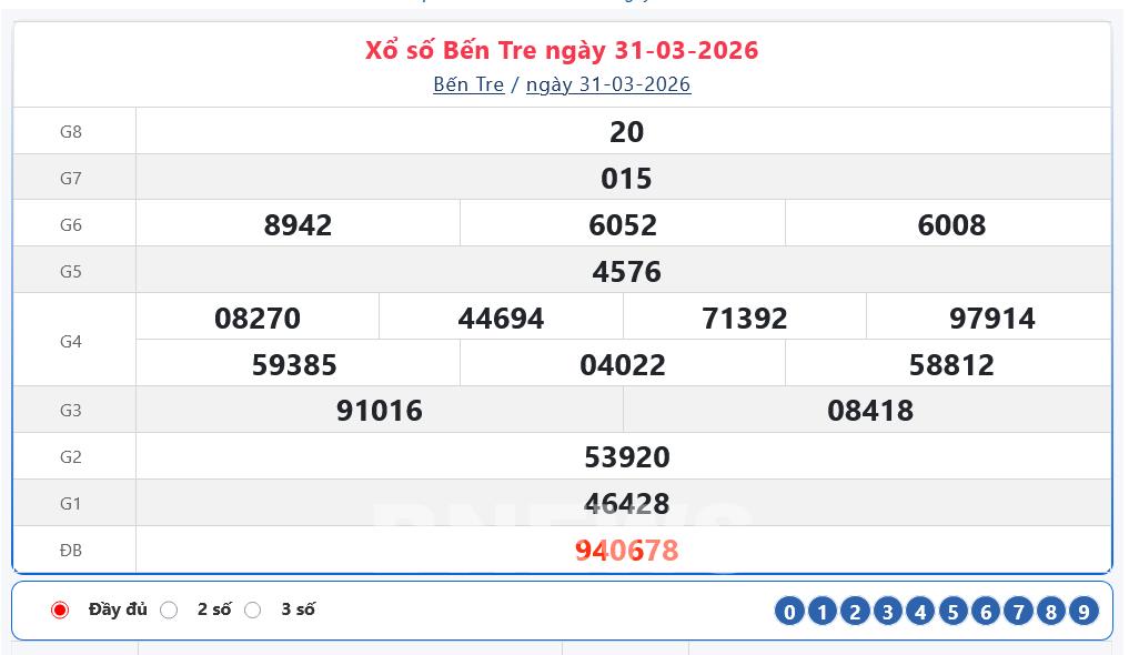 Kết quả xổ số Bến Tre Thứ Ba ngày 31/3/2026