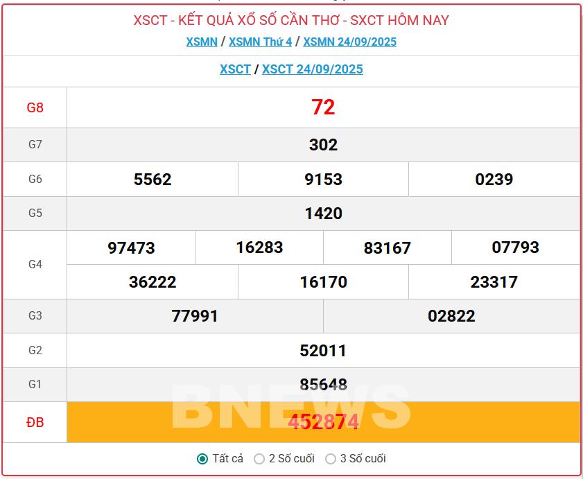 Bnews. XSCT 24/9. Kết quả xổ số hôm nay ngày 24/9. XSCT Thứ Tư. Trực tiếp KQXSCT ngày 24/9. Kết quả xổ số Cần Thơ hôm nay ngày 24/9/2025. Kết quả xổ số Cần Thơ Thứ Tư ngày 24/9/2025.