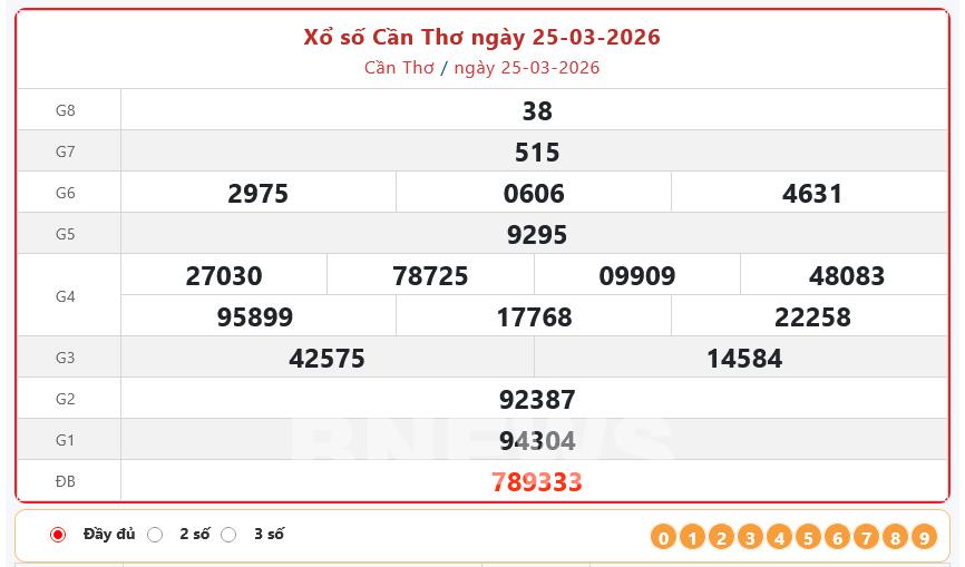 Bnews. XSCT 25/3. Kết quả xổ số hôm nay ngày 25/3. XSCT Thứ Tư. Trực tiếp KQXSCT ngày 25/3. Kết quả xổ số Cần Thơ hôm nay ngày 25/3/2026. Kết quả xổ số Cần Thơ Thứ Tư ngày 25/3/2026.