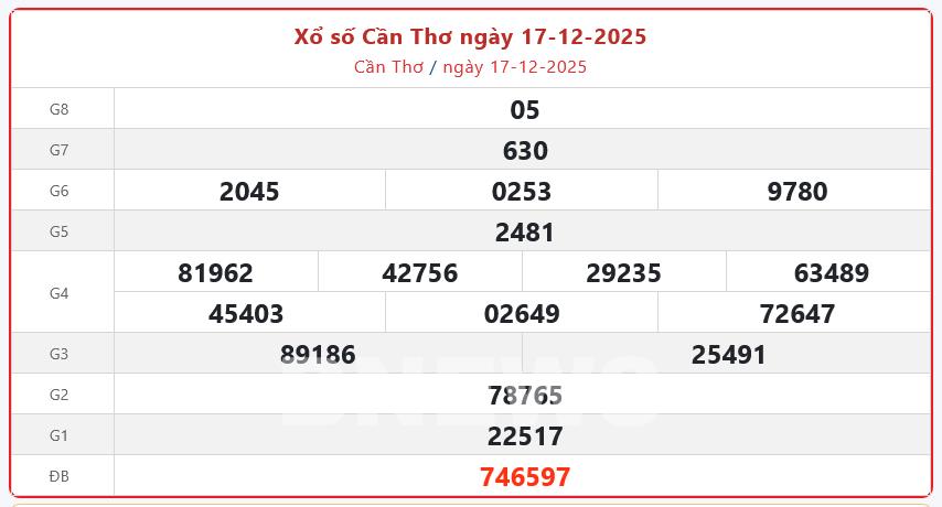 Kết quả xổ số Cần Thơ Thứ Tư ngày 17/12/2025