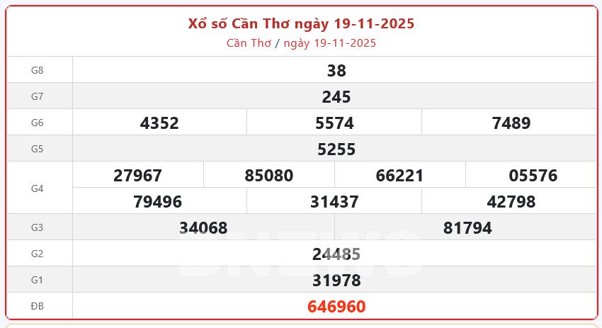 Kết quả xổ số Cần Thơ Thứ Tư ngày 19/11/2025