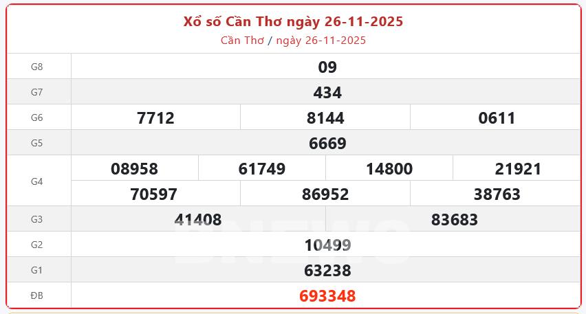 Kết quả xổ số Cần Thơ Thứ Tư ngày 26/11/2025