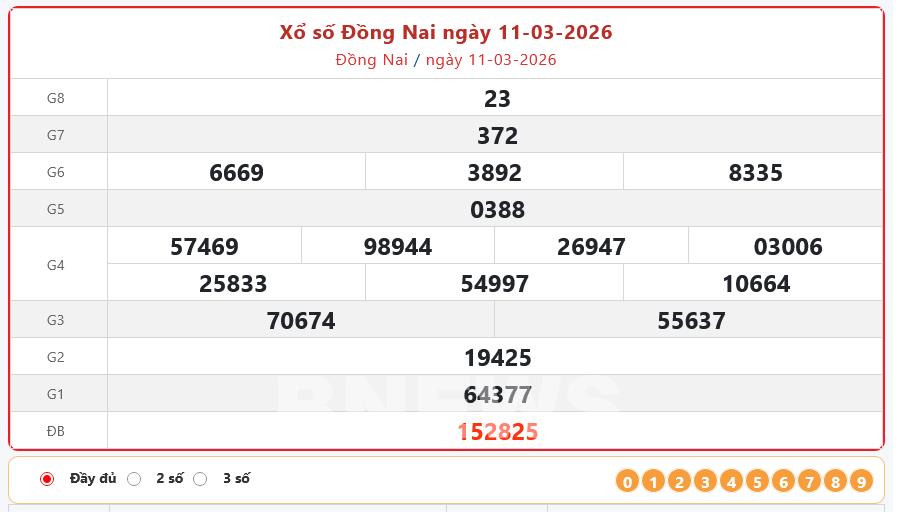 Kết quả xổ số Đồng Nai Thứ Tư ngày 11/3/2026