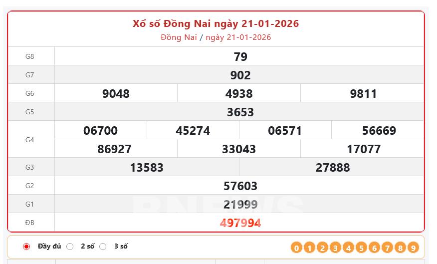 Bnews. XSĐN 21/1. XSDN. Kết quả xổ số hôm nay ngày 21/1. XSĐN Thứ Tư. Trực tiếp KQXSĐN ngày 21/1. Kết quả xổ số Đồng Nai hôm nay ngày 21/1/2026. Kết quả xổ số Đồng Nai Thứ Tư ngày 21/1/2026.