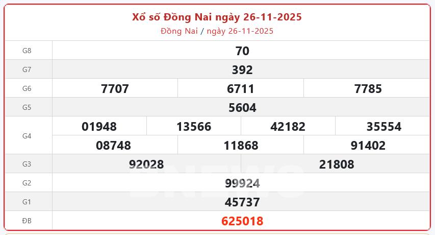 Kết quả xổ số Đồng Nai Thứ Tư ngày 26/11/2025