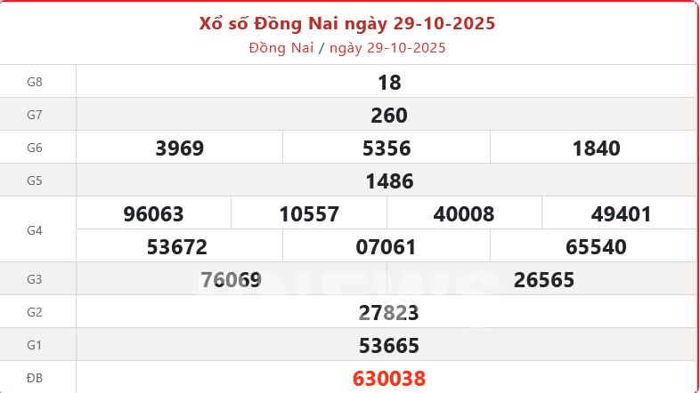 Kết quả xổ số Đồng Nai Thứ Tư ngày 29/10/2025