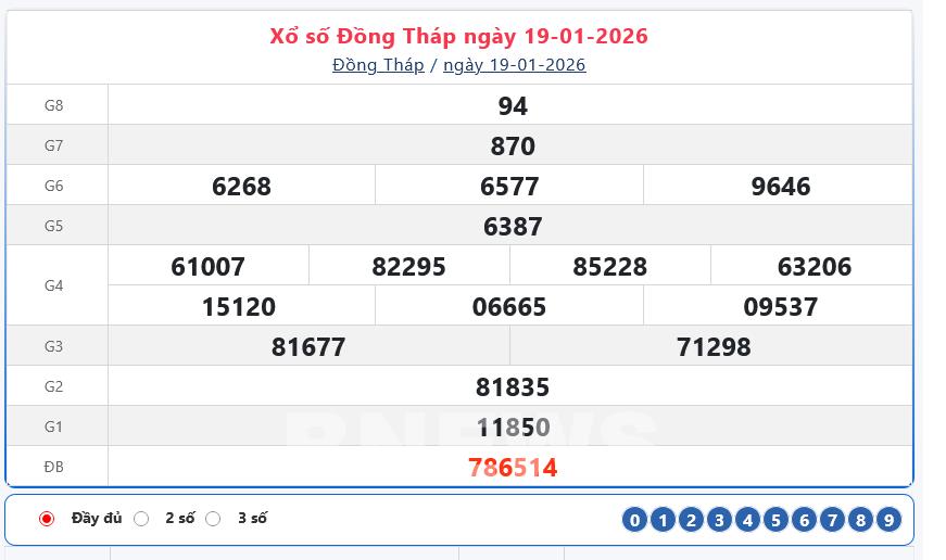 Bnews. XSĐT 19/1. Kết quả xổ số hôm nay ngày 19/1. XSĐT Thứ Hai. Trực tiếp KQXSĐT ngày 19/1. Kết quả xổ số Đồng Tháp hôm nay ngày 19/1/2026. Kết quả xổ số Đồng Tháp Thứ Hai ngày 19/1/2026.