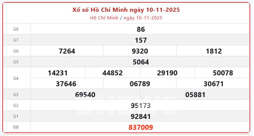 Kết quả xổ số TP. Hồ Chí Minh Thứ Hai ngày 10/11/2025