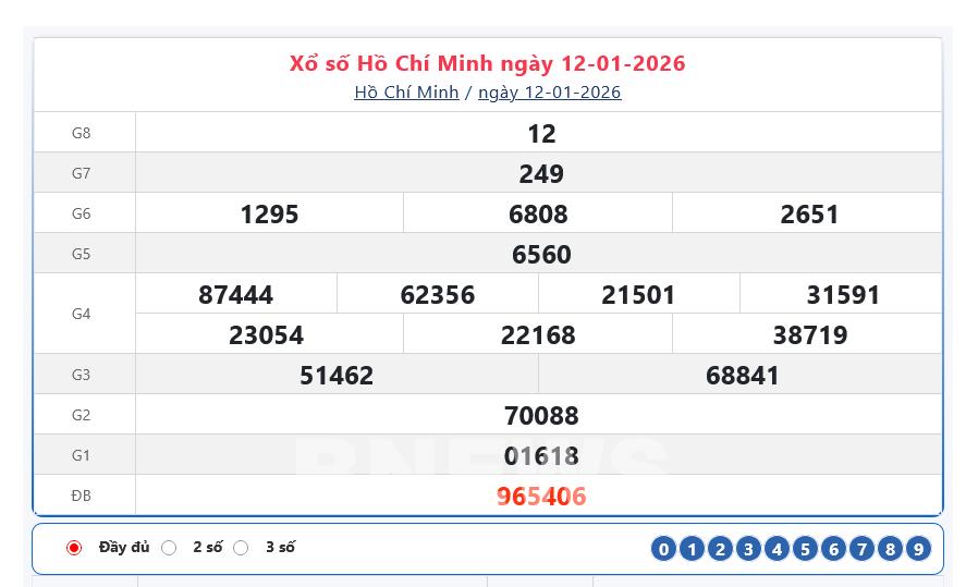 Bnews. XSHCM 12/1. Kết quả xổ số hôm nay ngày 12/1. XSHCM Thứ Hai. Trực tiếp KQXSHCM. Kết quả xổ số Hồ Chí Minh hôm nay ngày 12/1/2026.Kết quả xổ số Hồ Chí Minh ngày 12/1/2026. XS Sài Gòn.