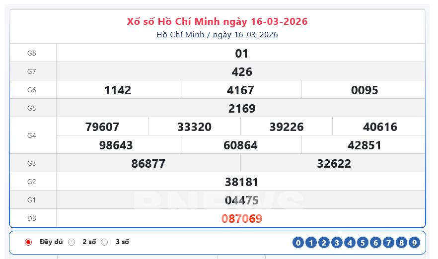 Kết quả xổ số TP. Hồ Chí Minh Thứ Hai ngày 16/3/2026