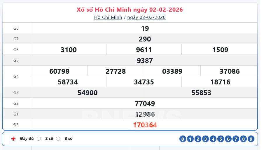 Kết quả xổ số TP. Hồ Chí Minh Thứ Hai ngày 2/2/2026