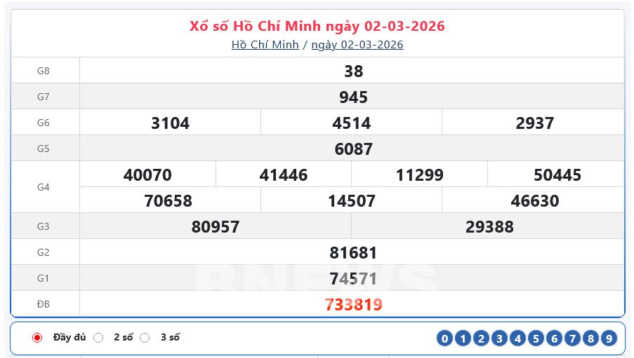 Bnews. XSHCM 2/3. Kết quả xổ số hôm nay ngày 2/3. XSHCM Thứ Hai. Trực tiếp KQXSHCM. Kết quả xổ số Hồ Chí Minh hôm nay ngày 2/3/2026.Kết quả xổ số Hồ Chí Minh ngày 2/3/2026. XS Sài Gòn.