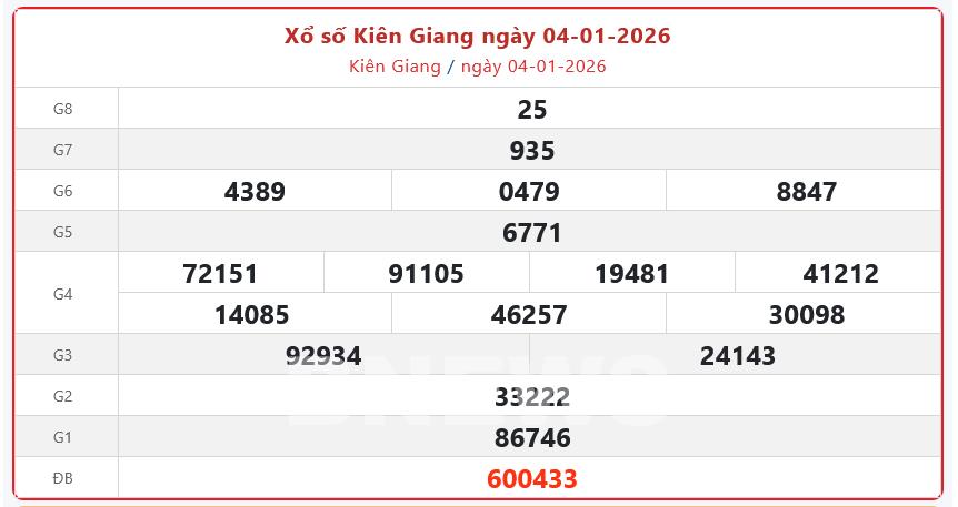 Bnews. XSKG 4/1. Kết quả xổ số hôm nay ngày 4/1. XSKG Chủ nhật. Trực tiếp KQXSKG ngày 4/1. Kết quả xổ số Kiên Giang hôm nay ngày 4/1/2026.