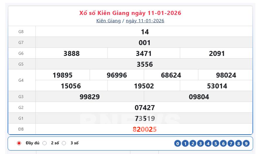 Bnews. XSKG 11/1. Kết quả xổ số hôm nay ngày 11/1. XSKG Chủ nhật. Trực tiếp KQXSKG ngày 11/1. Kết quả xổ số Kiên Giang hôm nay ngày 11/1/2026.