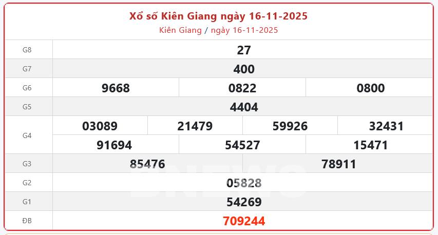 Kết quả xổ số Kiên Giang Chủ nhật ngày 16/11/2025