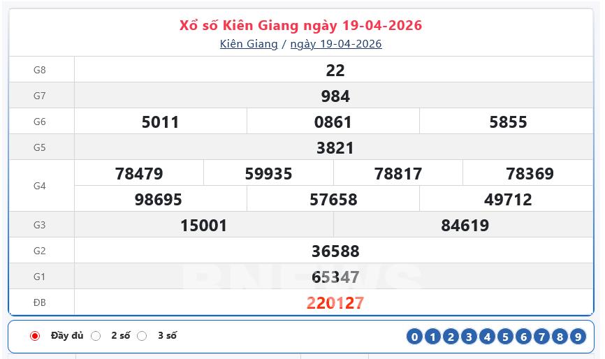 Kết quả xổ số Kiên Giang Chủ nhật ngày 19/4/2026
