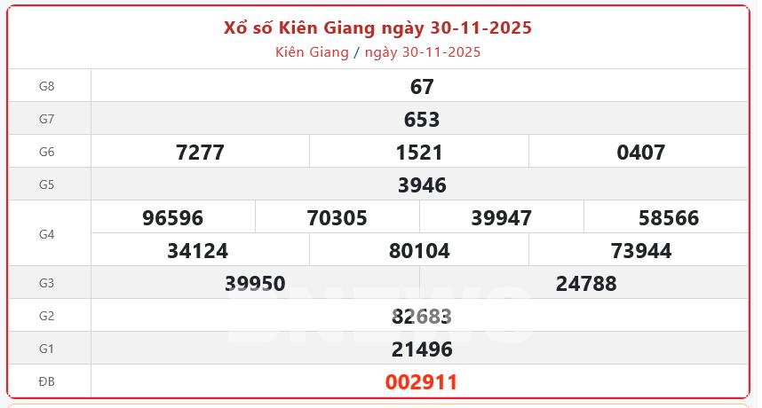 Bnews. XSKG 30/11. Kết quả xổ số hôm nay ngày 30/11. XSKG Chủ nhật. Trực tiếp KQXSKG ngày 30/11. Kết quả xổ số Kiên Giang hôm nay ngày 30/11/2025.